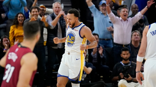 He pounded his chest with both hands and hollered in delight after a dazzling sequence in which he crossed over twice to lose Herro, then stepped back and sunk a 3-pointer with 5:32 left that put Golden State ahead 108-100.